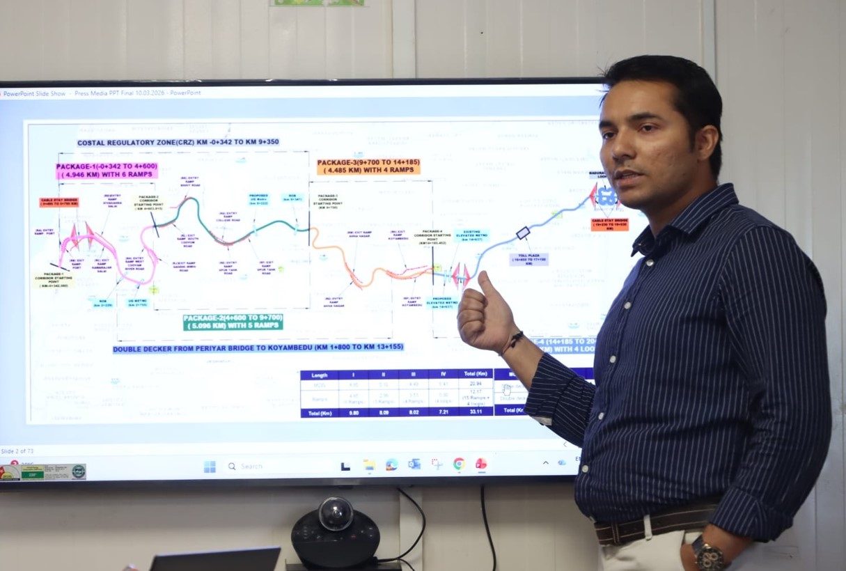 Speaking on the advanced construction methodology, Shivam Sharma, Project Director, NHAI – PIU, Chennai, highlighted that massive casting yards, including the 80-acre facility at EVP Film City, are being utilized to manufacture more than 500 pre-cast concrete bridge segments per month in advance.