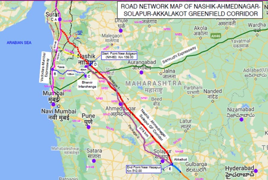 The greenfield corridor from Nashik to Akkalkot is proposed to be connected to Delhi-Mumbai Expressway near Vadhawan port interchange, Agra-Mumbai corridor at Nashik at junction with NH-60 (Adegaon) and Samruddhi Mahamarg at Pangri (near Nashik). The proposed corridor will provide through connectivity from west coast to east coast.