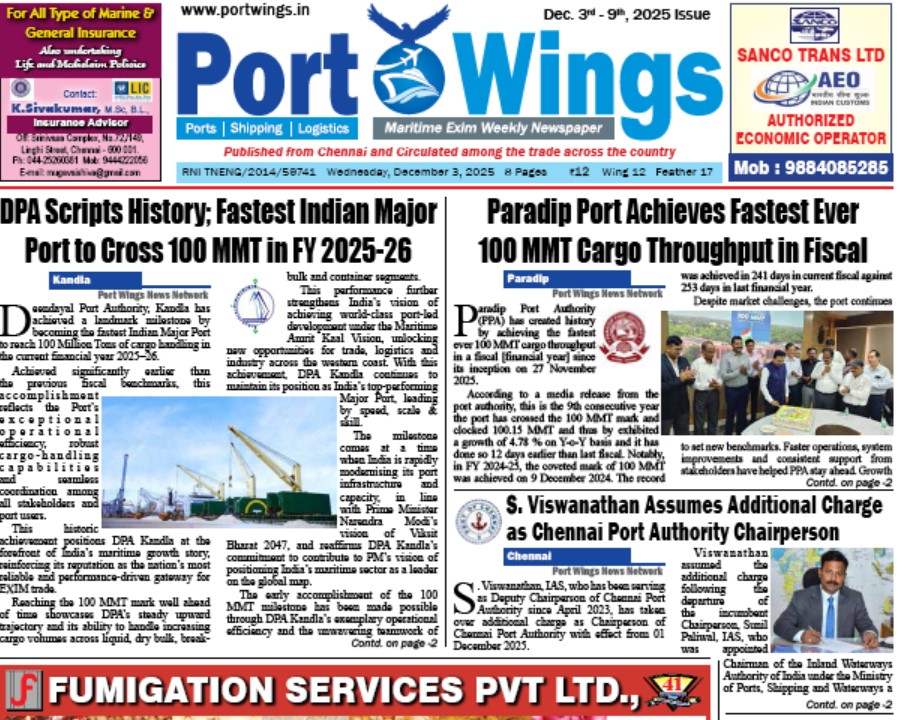 Epaper Port Wings 03 Dec 2025 ePaper December 3, 2025 0 About The Author Admin See author's posts Post navigation Previous: CMA CGM Launches TVI Service Connecting Thailand, Vietnam and Malaysia to South East India & Sri LankaNext: New Team Takes Charge of Institute of Chartered Shipbrokers More Stories Epaper Port Wings Maritime 21 Jan 2026 ePaper January 21, 2026 0 Epaper Port Wings Maritime 14 Jan 2026 ePaper January 13, 2026 0 Epaper Port Wings Maritime 7 Jan 2026 ePaper January 7, 2026 0 Leave a Reply Cancel replyYour email address will not be published. Required fields are marked *Comment * Name * Email * Website Save my name, email, and website in this browser for the next time I comment.