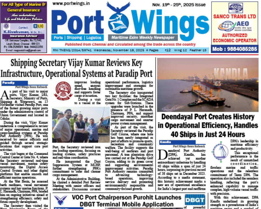 Epaper Port Wings 19 Nov 2025 ePaper November 19, 2025 0 About The Author Admin See author's posts Post navigation Previous: Chennai Port Authority Remembers V.O. Chidambaranar on his Memorial DayNext: AD Ports Group Signs Agreement With CMA CGM Group to Expand Terminal at Khalifa Port More Stories Epaper Port Wings Maritime 21 Jan 2026 ePaper January 21, 2026 0 Epaper Port Wings Maritime 14 Jan 2026 ePaper January 13, 2026 0 Epaper Port Wings Maritime 7 Jan 2026 ePaper January 7, 2026 0 Leave a Reply Cancel replyYour email address will not be published. Required fields are marked *Comment * Name * Email * Website Save my name, email, and website in this browser for the next time I comment.