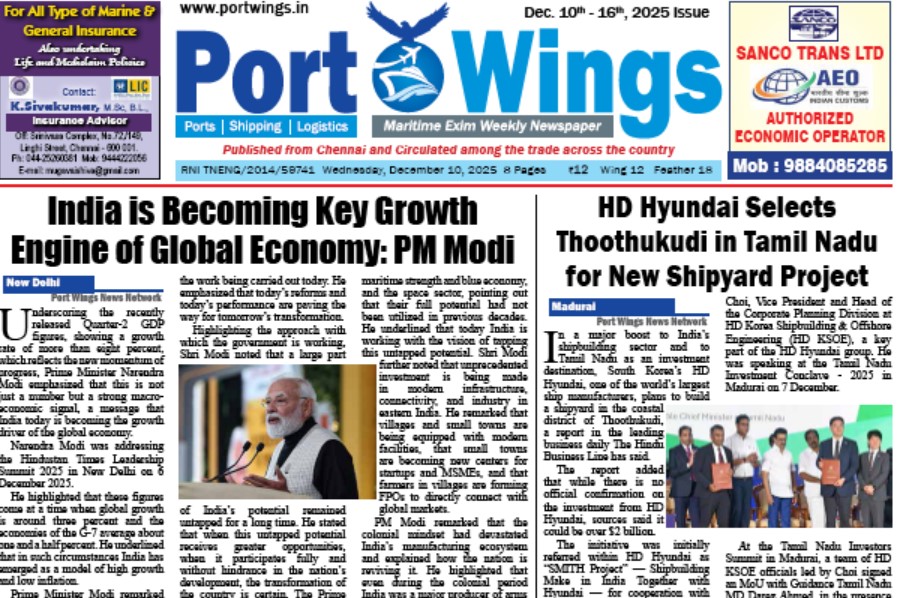 Epaper Port Wings Maritime 10 Dec 2025 ePaper December 10, 2025 0 About The Author Admin See author's posts Post navigation Previous: Ravish Kumar Singh Assumes Charge as JNPA’s Deputy ChairpersonNext: Customs Busts Gold-Smuggling Syndicate at Chennai Airport More Stories Epaper Port Wings Maritime 21 Jan 2026 ePaper January 21, 2026 0 Epaper Port Wings Maritime 14 Jan 2026 ePaper January 13, 2026 0 Epaper Port Wings Maritime 7 Jan 2026 ePaper January 7, 2026 0 Leave a Reply Cancel replyYour email address will not be published. Required fields are marked *Comment * Name * Email * Website Save my name, email, and website in this browser for the next time I comment.