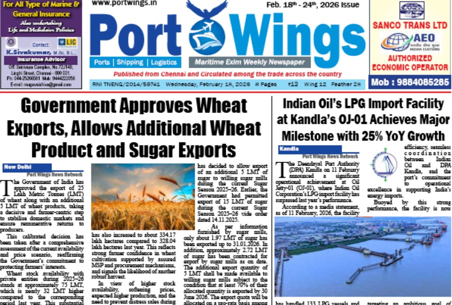 Epaper Port Wings Maritime 18 Feb 2026 ePaper February 18, 2026 0 About The Author Admin See author's posts Post navigation Previous: Kamarajar Port Hosts Delegates From DG ShippingNext: V.O. Chidambaranar Port Hosts First-of-its-Kind ‘AI-Powered Ports’ Session at India AI Impact Summit More Stories Epaper Port Wings Maritime 11 Feb 2026 ePaper February 10, 2026 0 Epaper Port Wings Maritime 4 Feb 2026 ePaper February 4, 2026 0 Epaper Port Wings Maritime 28 Jan 2026 ePaper January 27, 2026 0 Leave a Reply Cancel replyYour email address will not be published. Required fields are marked *Comment * Name * Email * Website Save my name, email, and website in this browser for the next time I comment.