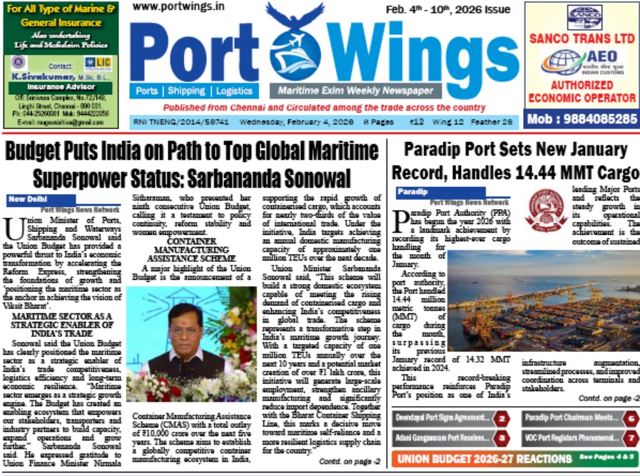 Epaper Port Wings Maritime 4 Feb 2026 ePaper February 4, 2026 0 About The Author Admin See author's posts Post navigation Previous: Union Govt’s Atmanirbhar Container Drive Takes Shape With BCSL MoUNext: Puerto Aguadulce Enhances Capacity With new Quay Cranes, Hybrid RTGs More Stories Epaper Port Wings Maritime 28 Jan 2026 ePaper January 27, 2026 0 Epaper Port Wings Maritime 21 Jan 2026 ePaper January 21, 2026 0 Epaper Port Wings Maritime 14 Jan 2026 ePaper January 13, 2026 0 Leave a Reply Cancel replyYour email address will not be published. Required fields are marked *Comment * Name * Email * Website Save my name, email, and website in this browser for the next time I comment.