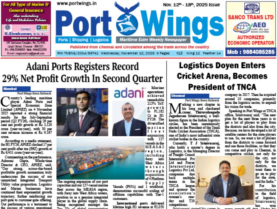 Epaper Port Wings Maritime Newspaper 12 Nov 2025 ePaper November 12, 2025 0 About The Author Admin See author's posts Post navigation Previous: VOC Port Hits New Milestone in Windmill Blades Handling, Records 61 % Jump in First 7 MonthsNext: DP World Commences Operations at Tartus Port in Syria More Stories Epaper Port Wings Maritime 21 Jan 2026 ePaper January 21, 2026 0 Epaper Port Wings Maritime 14 Jan 2026 ePaper January 13, 2026 0 Epaper Port Wings Maritime 7 Jan 2026 ePaper January 7, 2026 0 Leave a Reply Cancel replyYour email address will not be published. Required fields are marked *Comment * Name * Email * Website Save my name, email, and website in this browser for the next time I comment.