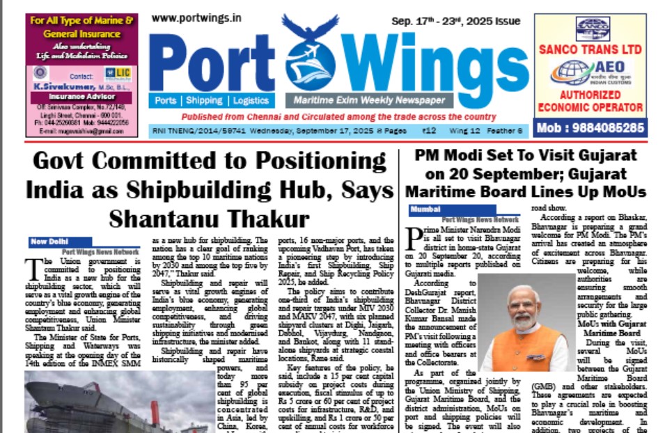 Ports Port Wings Maritime Weekly 17 Sept 2025 e-Paper Admin September 17, 2025 0 About The Author Admin See author's posts Post navigation Previous: India Marks Three Years of National Logistics Policy: Transforming India’s Supply Chain EcosystemNext: South Korea’s Busan New Port, India’s V.O. Chidambaranar Port To Sign MoU Soon? More Stories Ports AD Ports Group, China’s SPG Yantai Port Sign Deal to Develop Green Automotive Industrial Parks Admin October 3, 2025 0 Ports Chennai Port Celebrates “Swachh Bharat Diwas 2025” With Beach Cleaning Drive Admin October 3, 2025 0 Ports Deendayal Port, Kandla Celebrates Navratri with Operation Sindoor-Themed Garba Night Admin October 3, 2025 0 Leave a Reply Cancel replyYour email address will not be published. Required fields are marked *Comment * Name * Email * Website Save my name, email, and website in this browser for the next time I comment.